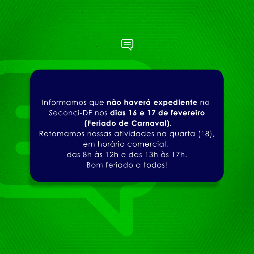 Informamos que, em razão do período de Carnaval, não haverá expediente no Seconci-DF nos dias 16 e 17 de fevereiro (segunda-feira e terça-feira). As atividades serão retomadas normalmente na quarta-feira, 18 de fevereiro, às 8h, em horário comercial: Das 8h às 12h e das 13h às 17h.